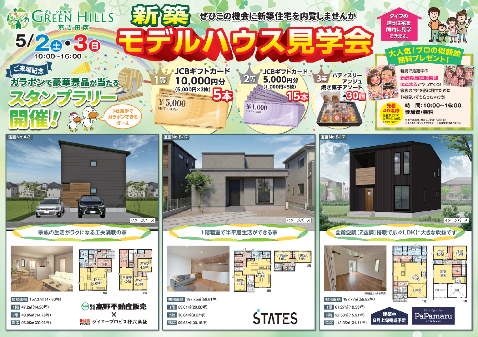 見学会期間中は、スタンプラリーやガラポン抽選、プロ似顔絵師による似顔絵プレゼントなど、ご家族で楽しめる来場特典もご用意しています。